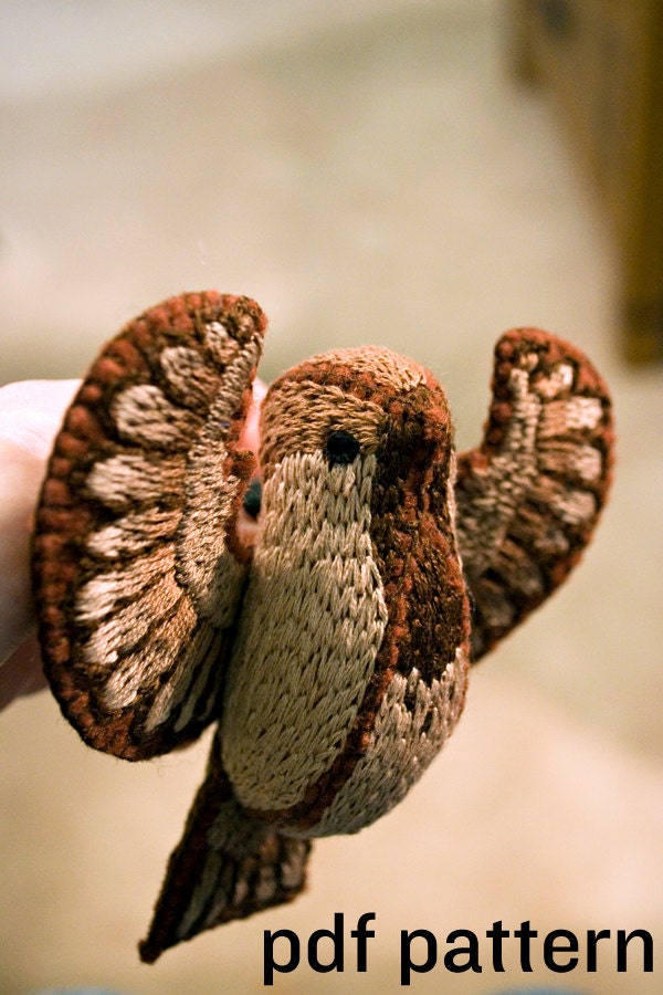 Please note that the first bird pictured is a very involved project and may take a while to complete, especially if you choose to fully cover it in embroidery. It's got all the explanations needed for beginners to experts. Every bird is a different difficulty level for those who want to work up to a fully embroidered bird. Birds will be around 5" long including the tail and 5-6" wide including the wings. They may turn out slightly smaller if you include a lot of embroidery, because a lot of thread tension may cause shrinkage.